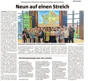 Am 16.8.2023 erfolgte im Rahmen einer Feierstunde im Rathaus die Preisverleihung für den zweiten Platz des Heimatpreises 2022 der Stadt Steinfurt durch die Bürgermeisterin, Frau Bögel-Hoyer, in Anwesenheit der Schulleitung, Herrn Hornemann und Herrn Stienhenser, und der anderen Preisträger der Jahre 2020-2022. Mit diesem Preis wird die jahrelange Arbeit von Herrn Kraaibeek für die Historische Bibliothek gewürdigt. Damit geht ein herzlicher Dank an die Jury und alle, die die Arbeit von Herrn Kraaibeek tatkräftig unterstützen!