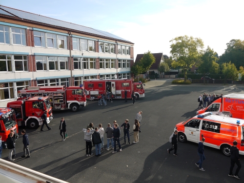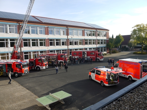 Unsere Schule hat sich am Freitag an der bundesweiten Woche der Wiederbelebung beteiligt. Neben einer Zurschaustellung von Rettungsfahrzeugen auf dem Schulhof, die vor allem bei den jüngeren Schüler*innen gut ankamen, lernten auch ca. 400 Schülerinnen und Schüler wie man einen Menschen wiederbelebt. Ein prominenter Gast war Landrat Dr. Martin Sommer, der sich prompt dazu überreden ließ, sich selbst an einer Herz-Massage zu versuchen. Vor Ort berichtete auch ein Team des WDR von der Aktion und berichtete in der Lokalzeit. Hier geht es zum ↗Video (externe Seite des WDR, bis ca. Minute 18 scrollen).